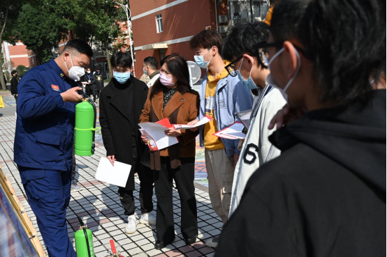 11月9日当天,保卫处在学校红旗广场进行了“落实消防责任,防范安全风险”为主题的大型消防宣传。按疫情防控要求,选择空旷地带设置消防宣传展台,布置大型展板,播放高校火灾警示教育片,接受学生咨询服务,派发宣传知识单和宣传手册等。张颖江校长,张书玉董事长亲临现场指导工作。