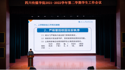 2022年2月24日下午,四川传媒学院2021-2022学年第二学期学生工作会议在艺术交流中心召开。会议由学生工作部(处)长唐杰主持,四川传媒学院校长张颖江、董事长张书玉、党委副书记、副校长刘黎、各院系部党总支(支部)书记、副书记、学生工作部、保卫处、就业指导中心以及全体辅导员老师参加了会议。