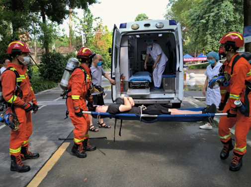 郫都区消防救援大队出动5辆消防车并派出20名消防指战员配合本次活动,演练方案分为防火、灭火的技巧和方法、人员逃生疏散、救人进行。随着警报声响起,学生们捂住口鼻有序跑出二食堂,紧急疏散。学校微型消防站立即出动,进行初期灭火,消防救援指战员利用消防车进行喷水灭火。当发现有受伤学生被困,消防救援指战员紧急将学生成功救出。