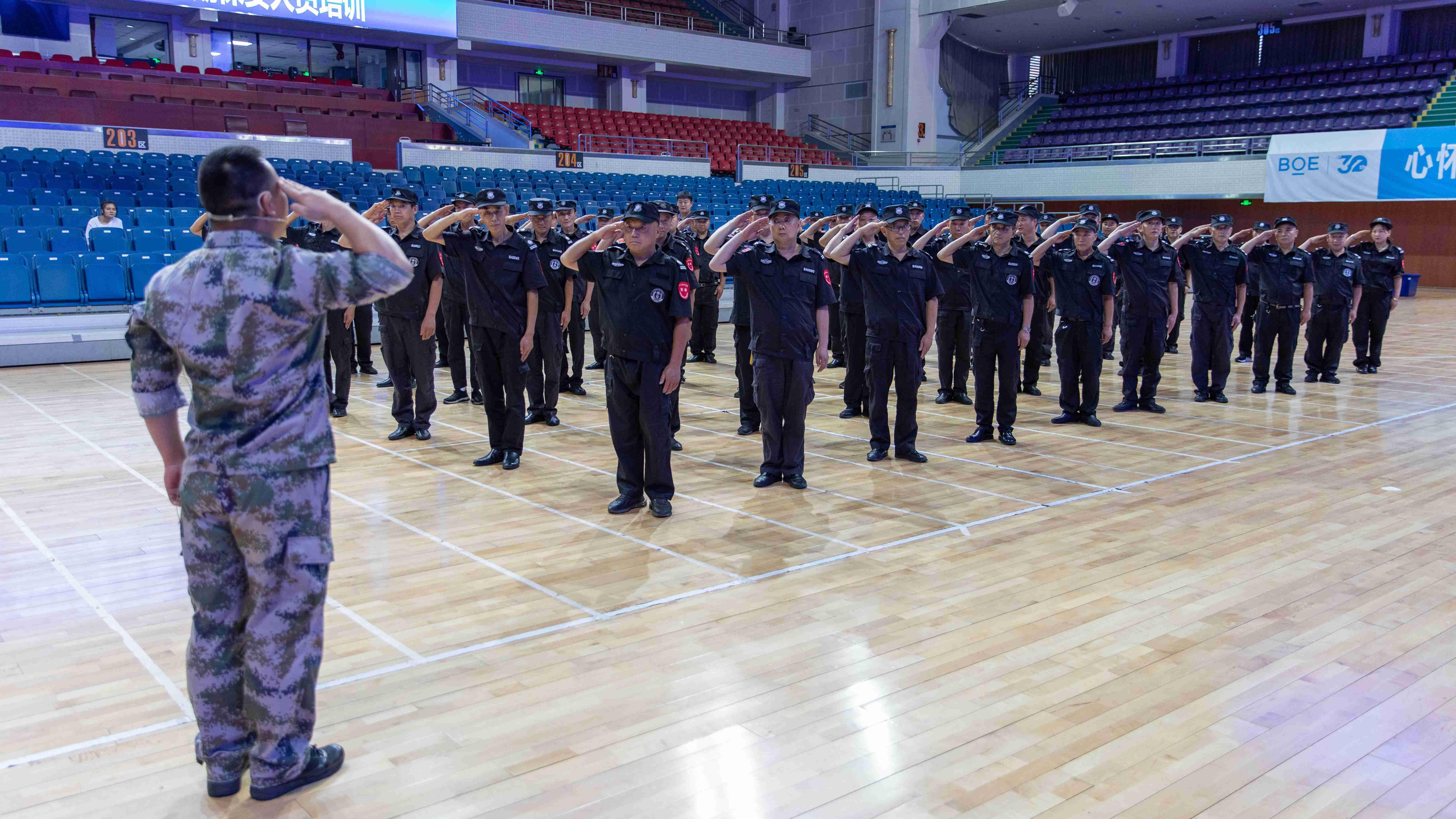 上午从队列训练、交通手势、常用防爆装备讲解介绍、常用防爆装备使用与分组练习、防爆装备使用与实际演练五个科目对保安人员进行了培训。训练内容包括整队报数、整理着装、立正稍息跨立、停止间转法、三大步伐、敬礼等内容。