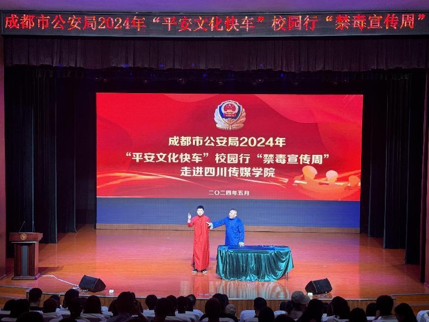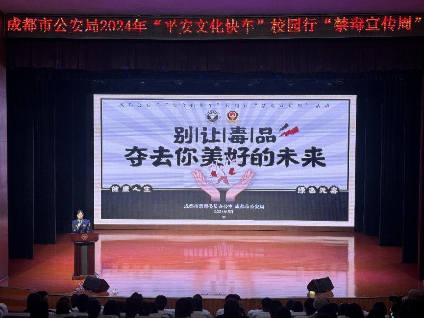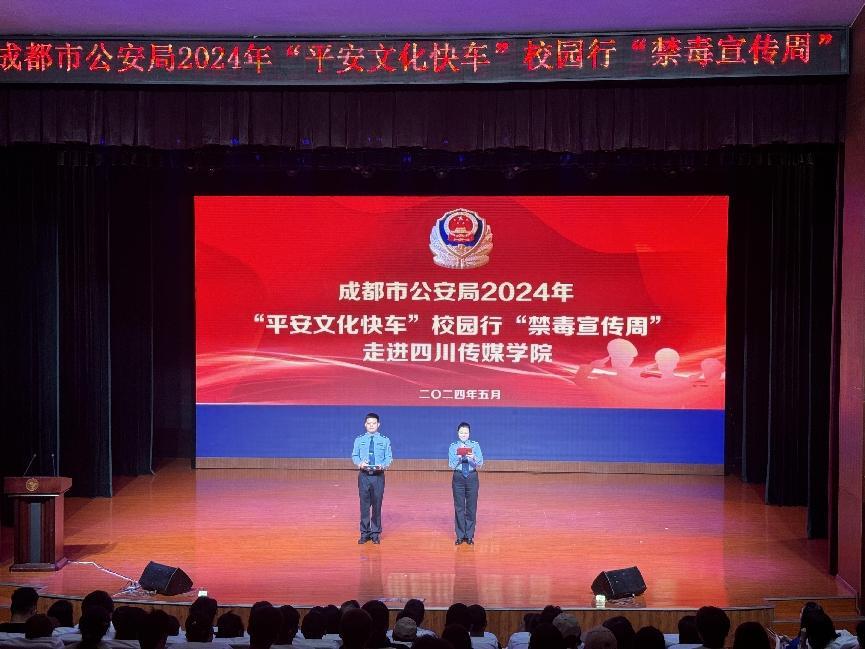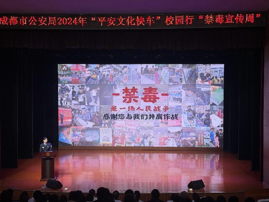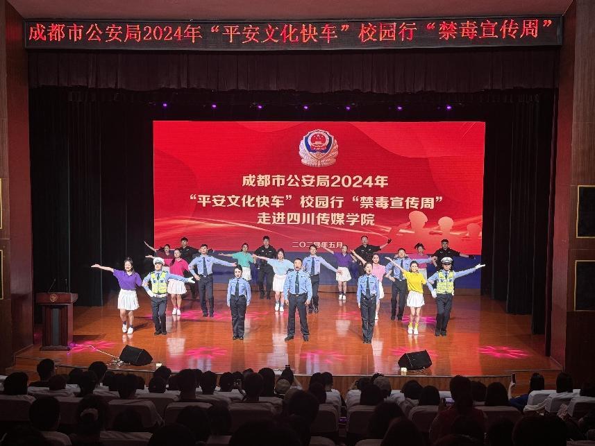 为进一步普及禁毒知识,扎实推进禁毒宣传教育活动,5月23日,由成都市公安局主办,学校保卫工作部、学生工作部承办的“平安文化快车”校园行“禁毒宣传周”活动在我校艺术交流中心开展,以寓教于乐的文艺方式深入推进禁毒宣传,我校党委副书记、副校长刘黎,校党委常委、学生工作部长唐杰,保卫工作部长黄华、各有关院系领导以及300名学生参加此次活动。