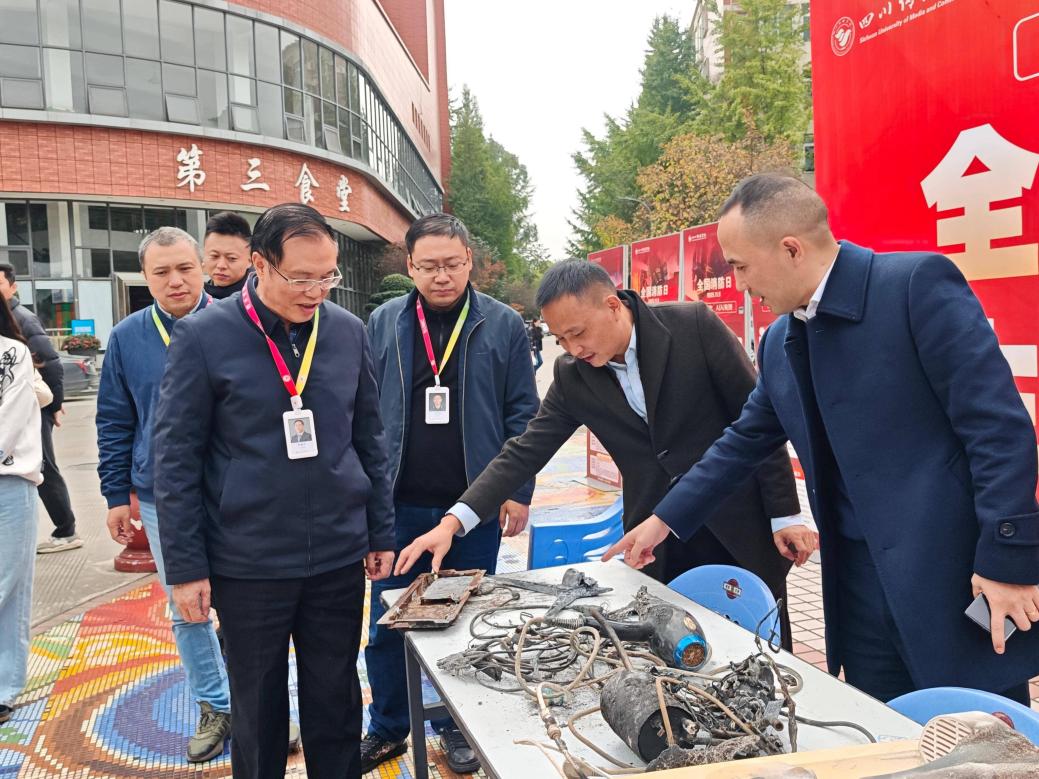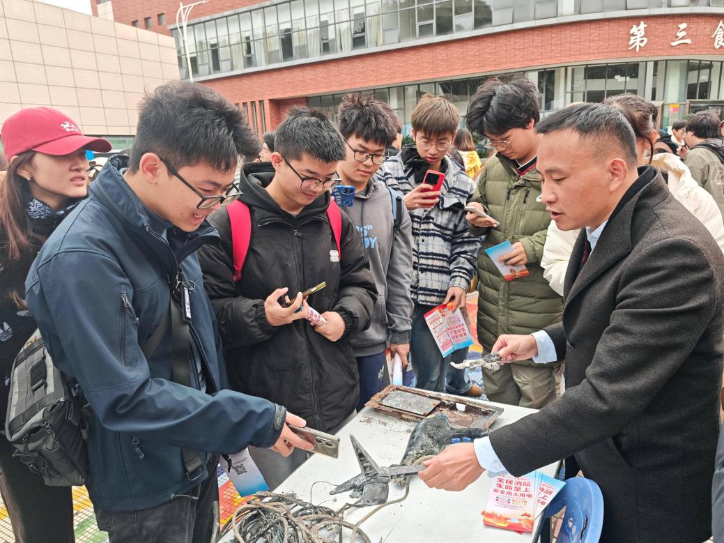 活动现场,保卫工作部消防科王科长,围绕“知险避险、防患未然”的核心主题开展宣传。在消防安全警示教育展区,他向师生们细致展示了我校过往火灾事故中的被烧实物证据,包括烧毁的电器设备等。“这些看似不起眼的隐患,一旦引发火灾,就会造成难以挽回的损失。”,生动讲解了火灾发生的原因、蔓延的速度以及正确的初期处置方法,用真实案例敲响消防安全警钟,让在场师生深刻认识到“隐患险于明火,防范胜于救灾”的重要性。