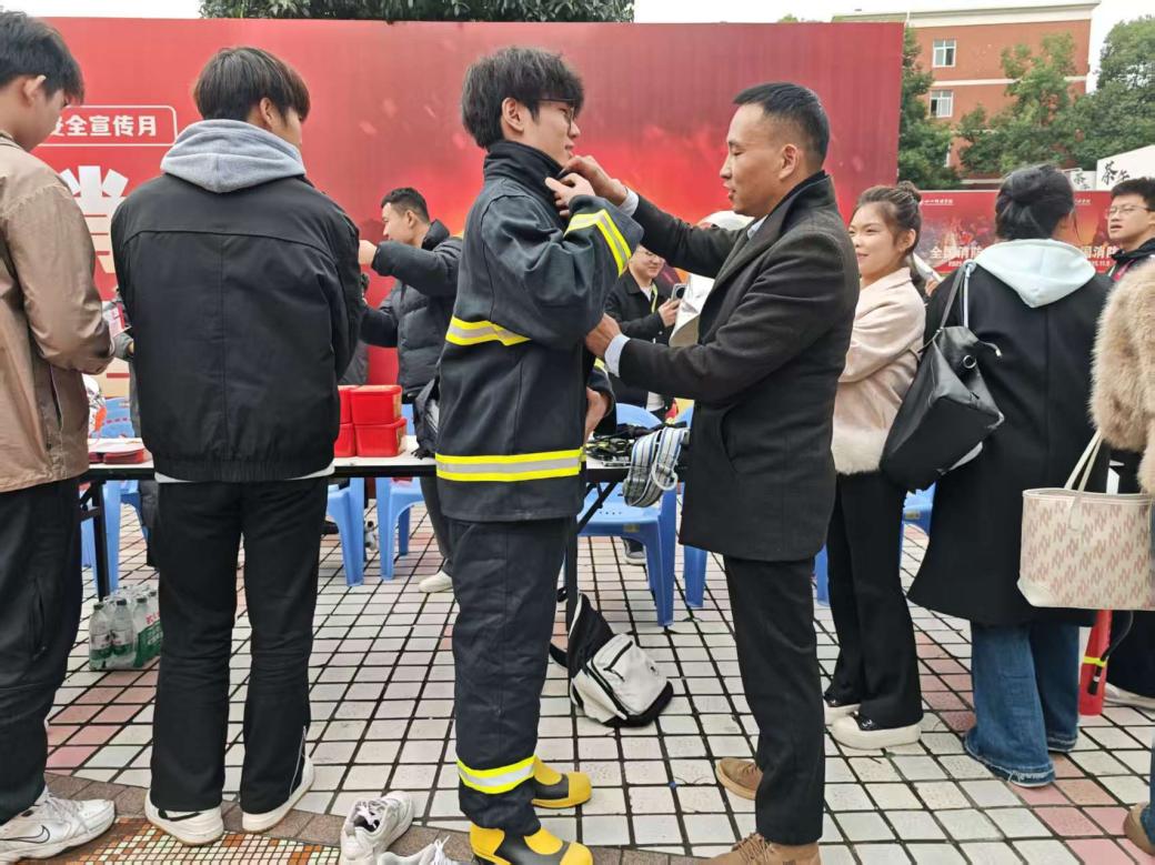 在消防器材实操体验区,准备了灭火器、消防水带、灭火毯以及消防服等专业器材,工作人员示范消防器材的正确穿戴和使用方法:从消防服的快速穿戴步骤、灭火器“提、拔、握、压”四步法,到消防水带的连接与喷射技巧,每一个动作都讲解细致、演示规范。师生们纷纷主动上前体验,亲手操作灭火器模拟灭火、穿戴消防服感受“消防员视角”,在实践中掌握了实用的消防技能,有效消除了对消防器材的“陌生感”。